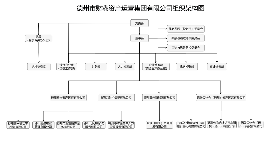 德州市財(cái)鑫集團(tuán)是經(jīng)德州市委、市政府批準(zhǔn)設(shè)立的市屬國有企業(yè),由德州市財(cái)政局代為履行出資人及監(jiān)管職責(zé),2021年1月注冊(cè)成立,注冊(cè)資本金13300萬元。集團(tuán)職能定位為市級(jí)行政事業(yè)性國有資產(chǎn)統(tǒng)籌盤活的運(yùn)營平臺(tái),承擔(dān)國有資產(chǎn)保值增值職責(zé)。主要功能是:統(tǒng)一管理和市場(chǎng)化運(yùn)營納入公司運(yùn)營資產(chǎn);受托管理市級(jí)政府公物倉資產(chǎn),對(duì)市級(jí)行政事業(yè)單位需要的相關(guān)資產(chǎn)進(jìn)行調(diào)劑配置;在政策允許范圍內(nèi)開展投融資業(yè)務(wù),確保可持續(xù)發(fā)展。公司現(xiàn)有職工總數(shù)39人,公司總部設(shè)紀(jì)檢監(jiān)察內(nèi)設(shè)機(jī)構(gòu)和6個(gè)內(nèi)設(shè)部室,下設(shè)4家一級(jí)子公司、9家二級(jí)子公司,實(shí)行扁平式和層級(jí)式相結(jié)合的管控體系。