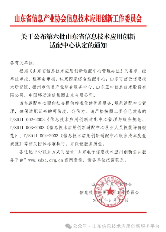 5月13日,山東省信息產(chǎn)業(yè)協(xié)會(huì)信息技術(shù)應(yīng)用創(chuàng)新工作委員會(huì)印發(fā)《關(guān)于公布第六批山東省信息技術(shù)應(yīng)用創(chuàng)新適配中心認(rèn)定的通知》,德州市信息產(chǎn)業(yè)綜合服務(wù)中心成功通過(guò)山東省信息技術(shù)應(yīng)用創(chuàng)新適配中心認(rèn)定,成為德州市首個(gè)信息技術(shù)應(yīng)用創(chuàng)新綜合適配中心。